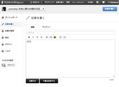 とりあえずスクリーンショットを貼ってみた。 執筆画面 設定画面 何ができるかといえば、残念ながらまだほとんど何もできない。見たままモード (WYSIWYG) が使えるようになったそうだが、WYSIWYG は昔から好きじゃないので使わない。はてな記法万歳\(^o^)/…