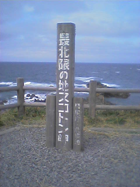11:30 スコトン岬というところに行く。木の看板(写真)の中には小銭が埋め込まれている。\500がないか探したらあったので本気で取り出す。最後は車の鍵を使い硬貨を押し出しゲット。